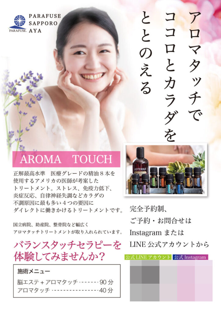 アロマタッチセラピーのチラシ制作事例です。コンセプトは、「癒しのアロマで女性特有の不調を整え、すべての女性を幸せで軽やかに」というイメージで作成しました。