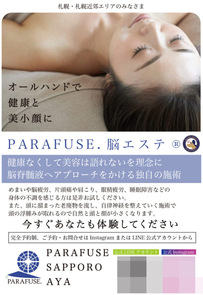 こちらはPARAFUSE脳エステのチラシ制作事例です。「オールハンドで体の不調を整える脳エステ」という既存のサービスコンセプトがありました。FCとして展開しているマッサージ施術サービス事業なので、すでにあるデザインのトーンマナーを守りつつ、癒しやマッサージ施術後のその先に待っている明るい世界をイメージして作成しました。